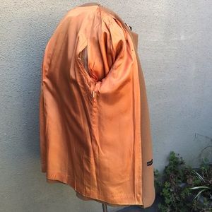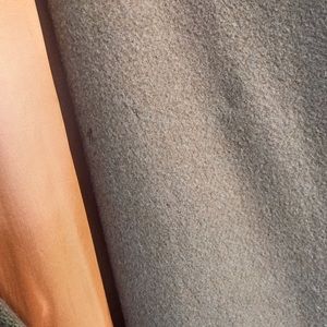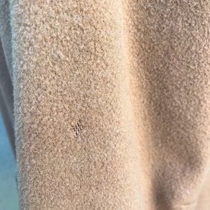 Beautiful wool camel color coat with leopard accents. Size L. Sadly, there is random moth damage. Inside, left sleeve lining is ripped. Across shoulders: 17”. Chest 44”. Hem 60”. Length HPS to Hem 33”. Price reflects poor condition.