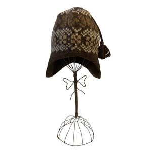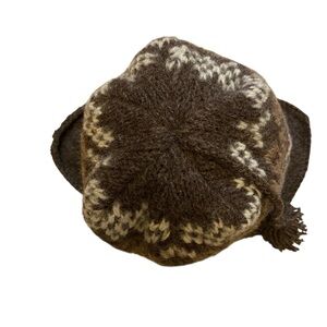 Vintage brown and oatmeal wool fair-isle beanie hat w ear flaps and a braided tassel. In good vintage condition.