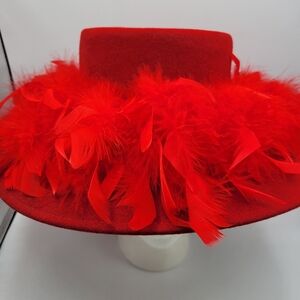 Red hot hat. So many feathers, you might have to tame this bird. But you will look amazing doing it. Pair with a fire red lip.