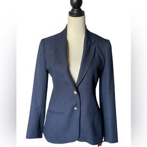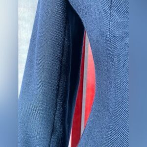 This navy blue single breasted two button blazer has faux pockets on the hips, and a brownish red silky lining. There is a little bit of pilling, but other than that this vintage blazer is in great condition. It is missing the size tag, but by my measurements it is an XS.