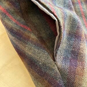 Handmade wool skirt, lined, with no interior tags. Given the waist measurement of 34”, and the fact that I tried it on and it is too big (I am a size 6),I am listing as a large. That measurement was taken with the hook and eye closure fastened, lying flat. The exterior part of the wrap skirt has an adjustable buckle.