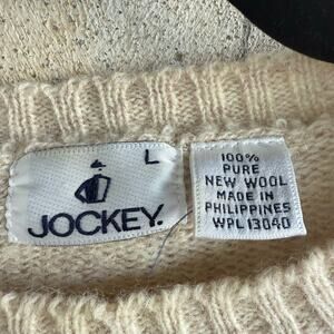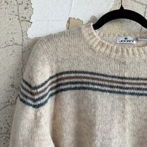 Vintage Jockey Sweater knit from 100% pure wool. Classic striped crewneck pullover in oatmeal with charcoal and blue stripes. Classic rib collar, cuffs, and hem, cut in an easy regular fit. The texture reads preppy grandpa, the stripes read effortless. It’s the kind of sweater you steal from someone who owns a sailboat or just looks like they do.