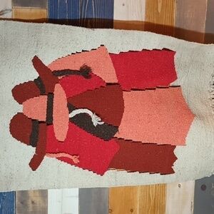 Beautiful vintage wall hanging. Great condition. Fringes bottom with bamboo pole. Soft cream colored background with three figures in vibrant red, coral, and terracotta colors. Such a unique piece of art. 29 x 47