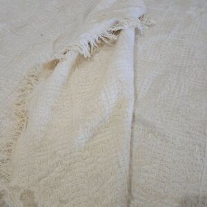 Vintage Wool Cream Textured Bedspread Blanket Fringe Queen 90" x 110"