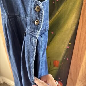 This Vintage Woolrich Dress in size M and blue denim color features a sleeveless design with a round neckline and button closure. The long A-Line dress is made of 100% cotton denim fabric, perfect for a casual occasion like travel, party, or summer outings. With a retro Western and hippie theme, this cottagecore barn and farm-inspired dress also includes pockets for added functionality. Made in the United States, this nature-inspired dress is ideal for the warm seasons of summer, fall, and spring.