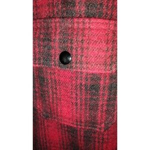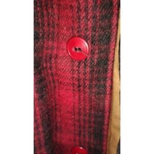 Vintage Woolrich Men's 44 Mackinaw Jacket in red buffalo plaid wool. This classic hunting jacket from the 60s or 70s features a button closure, wool lining, and insulation. Made in the USA, the Woolrich 503 model exudes a timeless outdoor style suitable for casual or workwear occasions.