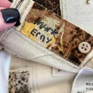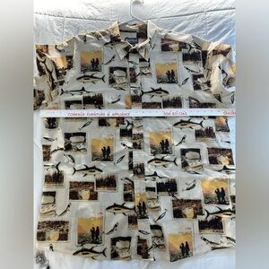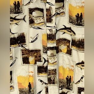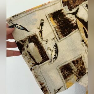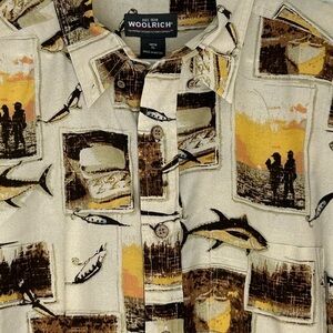 Vintage Woolrich Mens Fishing Fish Hook Print Button Down SS Shirt Beige Size XL