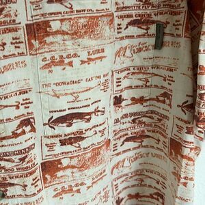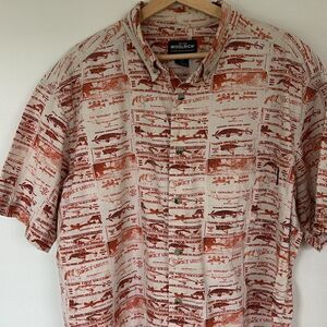 Vintage Woolrich Short Sleeve Button Down Fishing Lures Tan Rust Shirt Size L