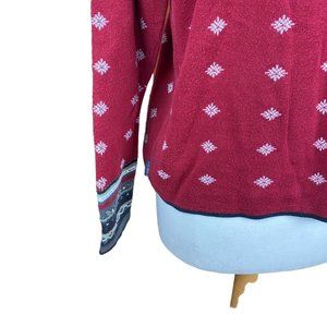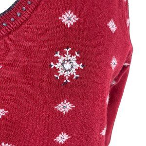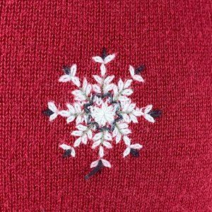 While this sweater is far from ugly, it will be a statement piece for any holiday gathering or party. A combination of jacquard knit snowflakes and embroidered detailing make this a stunning holiday sweater. Please note there is some light wear signs.