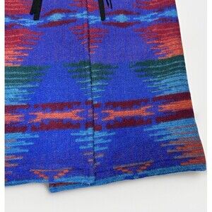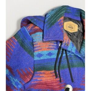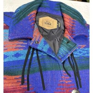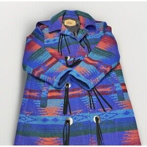 Make a bold statement with this stunning vintage Woolrich blanket coat, made in the USA. Featuring a vibrant Southwestern/Aztec pattern in rich jewel tones of blue, red, and green, its crafted from warm wool with concho-style toggle closures and a removable hood. Cozy, durable, and uniquely eye-catching perfect for collectors or lovers of classic Americana outerwear.