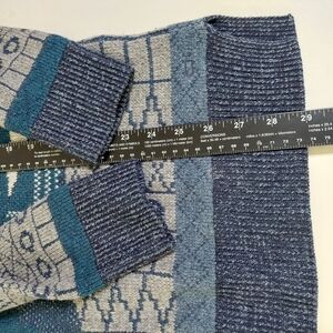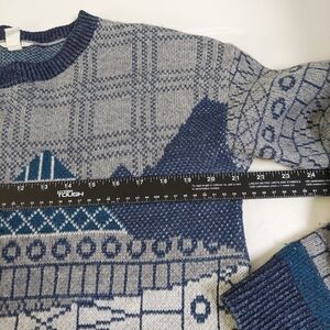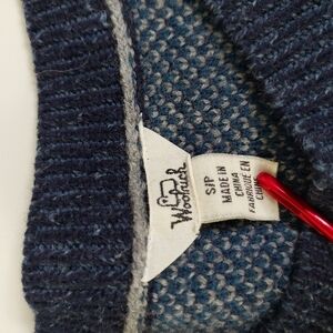 Keywords: Woolrich, sweater, knit, geometric, abstract, teal, blue, gray, wool blend, long sleeve, crew neck, pullover, small, S/P, winter