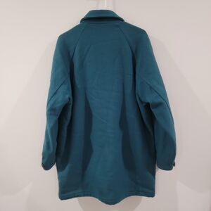This Vintage Woolrich Women's Wool Jacket in size XL is a classic mid-length trench-style blanket coat, perfect for the colder seasons of winter, fall, and spring. Made in the USA with a solid green color and a wool blend lining, this jacket features long sleeves, a zip and button closure, and a regular fit. The Woolrich brand adds a touch of authenticity to this timeless piece, making it ideal for travel or casual occasions. With its vintage appeal and Americana theme, this jacket is a stylish and comfortable addition to any woman's wardrobe.