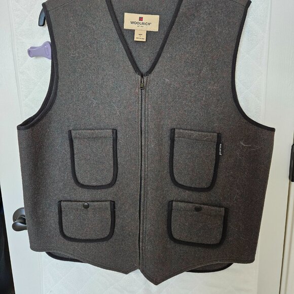 Vintage Woolrich wool men's conductor/hunting vest. Color is olive green with black piping. Excellent condition.