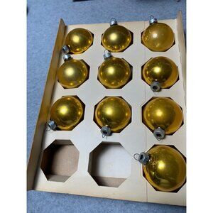 Some minor scratches and wear consistent with age. Box shows slight wear with one ornament slot empty. Ornament diameter = 2 inches.