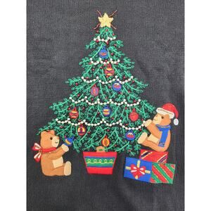 Vintage Work in Progress Embroidered Beaded Christmas Tree Sweater Size M Black Embellished Pearls Metallic Teddy Bears Holiday Ugly Christmas Sweater Long Length Tunic Shoulder Pads Gems Jewels Knit Grandma Grannycore