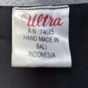 Label details: Brand tag reads "Ultra" with RN 74685. Tag states HAND MADE IN BALI INDONESIA.