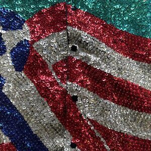 Handmade sequined vest with bold patriotic-inspired design on the front. The fully beaded front features green sequin background with silver star motifs and a red and silver wavy flag-style pattern accented with blue and silver details.