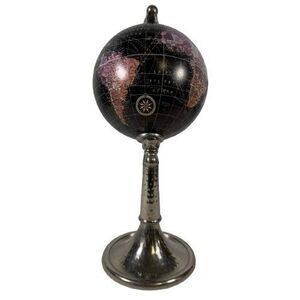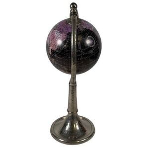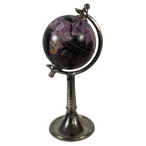 Decorative Vintage World Map Globe Sphere w/Metal Base Desk Tabletop Office Decor 12" Tall. It has different shades of purple and brown on a black background with a hammered metal pattern base. Excellent condition. Please see pictures.