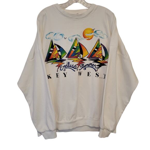 Vintage World View Key West sweatshirt, size XL, featuring a colorful 90s-style sailboat graphic with “Endless Summer” text. Made in USA from 100% cotton with ribbed cuffs, hem, and collar. Boxy Fit. Perfect for retro beachwear lovers or vintage graphic sweatshirt collectors.