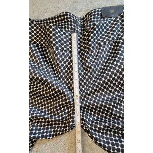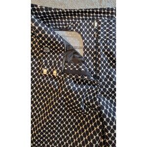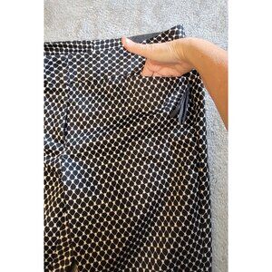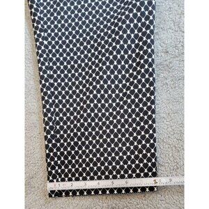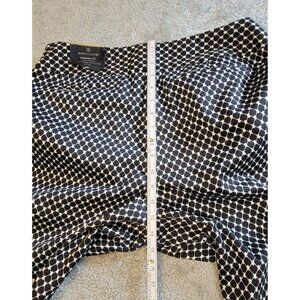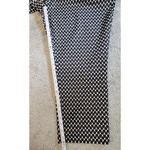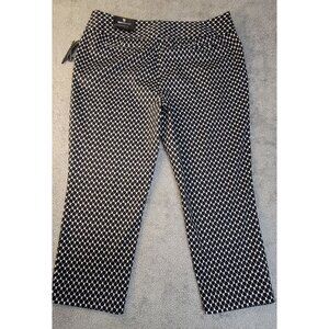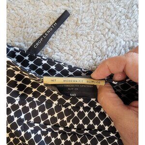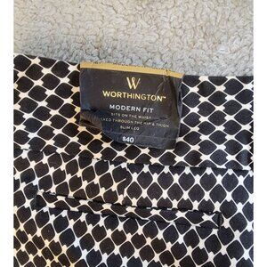These are Vintage Worthington chino capri pants, size 16T, featuring a distinctive black and white geometric pattern. The capri length typically hits around mid-calf or just above the ankles. They are slim leg, offering a clean, streamlined silhouette. They are a modern fit that sit on the waist and are relaxed through the thighs. Please see the provided photos for further details.