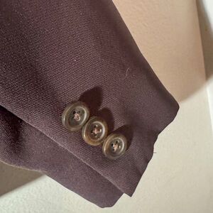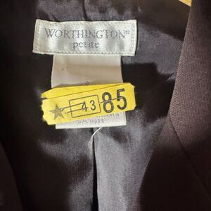 This is a classic vintage Worthington Petite blazer, a versatile piece for a professional or casual look. The blazer is a deep, rich brown color and features a classic three-button front closure. The sleeves have three matching buttons on each cuff. It has a notched lapel and a structured fit with some shaping at the waist. The two lower pockets are faux, but give the blazer a polished look. The blazer is fully lined with a polyester fabric and is made of 100% polyester. This is a timeless piece that is perfect for a business casual outfit, work wear, or for a dark academia aesthetic.