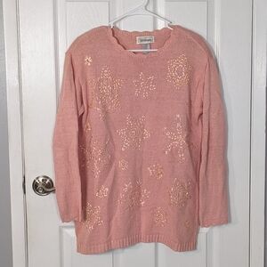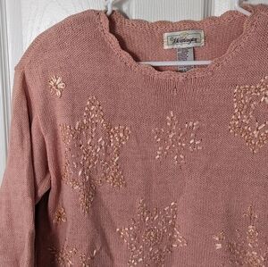 Women, Woman, Women's, Size M, Size Medium, Embroidered, Beaded, Raime, Cotton, Fall, Autumn, Autumnal, Winter, Embroidery, Beads, Embellished, Vintage, Retro, 80s, 1980s, Embellishment, Comfy, Warm, Cold Weather, Knit, Knitwear, Grandmacore, Grandma, Granny, Grannycore, Feminine, Girly, Dainty, Unique, Pretty, Rare, Sweater, Pullover, Sweaters, Hand Wash, Ribbon Details, Ribbons, Shoulder Pads, Long Sleeve, Comfortable, Cozy, Worthington, Pink, Ribbons, Balletcore, Winter Balletcore, Snow Flakes, Snowflakes, Stars, RN 15719