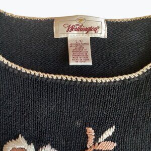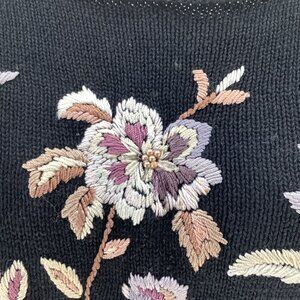 This elegant vintage Worthington knit sweater features intricate floral embroidery on a black backdrop, providing a sophisticated look. The long sleeves and medium size offer comfort and style, while the high-quality craftsmanship ensures durability.
