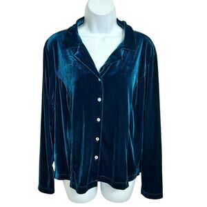 Vintage Worthington Teal Velour Button Front Blouse Sz 12 Large Top Long-Sleeve