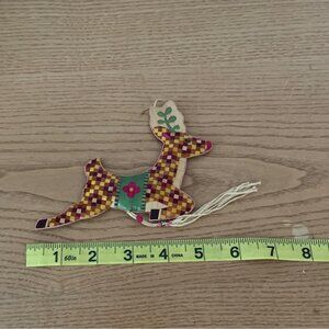 This delightful reindeer ornament features a woven pattern with a colorful design, adding a festive touch to your holiday decor.