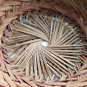 Round basket with burgundy weave matches the oval. 11" diameter & 1" depth. Has a blue line woven at base.