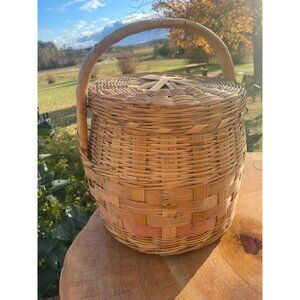 This vintage woven basket exudes rustic charm and functionality. Its lid and sturdy handle make it useful for carrying or storing items. The craftsmanship showcases an era when attention to detail was paramount, and it remains a timeless piece that can still serve various functions in a modern setting.