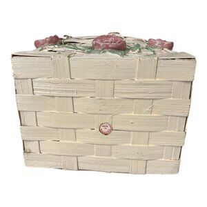 Add a touch of vintage charm to your home with this beautifully crafted woven basket, adorned with delicate ceramic rose appliqués and hand-painted green leaves. The ivory-painted finish and sturdy handle, accented with matching ceramic roses, make this piece perfect for cottagecore or shabby chic decor. Made in the Philippines, this basket likely dates from the 1980s to early 1990s, a period known for such handcrafted decorative items.