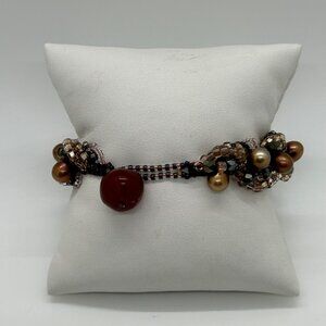 Vintage Woven Beaded Bracelet With Freshwater Pearls & Carnelian Bead Accent