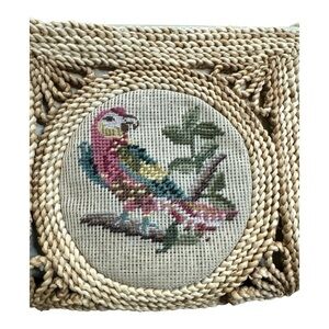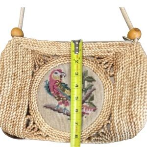Vintage Chic and stylish hand woven handbag featuring a colorful parrot needle point design. Perfect for adding a touch of nature-inspired elegance to your outfit. This is an amazing vintage bag. I got soooooooo many compliments on this bag while on vacation!! I’m used vintage condition. There is a corner of the straw that needs to be reattached with some thread. Pictured. Measurements in photos.