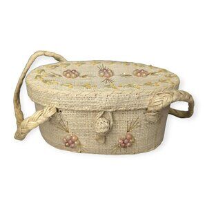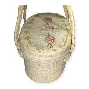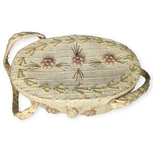 Vintage EUC woven fabric oval handbag with floral accents.