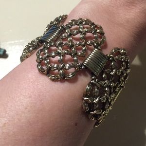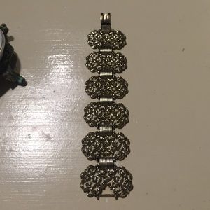 From my personal vintage collection. I've had this piece for about 20 years. Heavy goldtone metal clasp bracelet with links in a woven design. Good quality. No makers mark. Very elegant on. I love accessorizing with vintage pieces as the odds are in your favor nobody else will be wearing what you are.