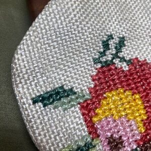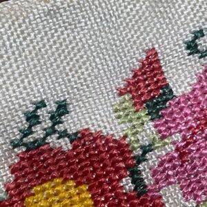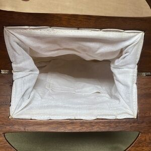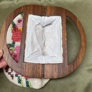 Vintage woven nylon pocket purse with top handles made of wood. Appears to be a woven faux embroider made of nylon. Original packing still inside, never used. Wood in excellent shape, cannot see any staining on purse. Mid Century Purse. measures: 11.5 x 11.15 from base to top of handles. See photos for more measurements and details. what is circled in photos is part of weave not a stain. some very tiny white material on wood in one place. see photos.