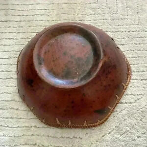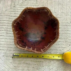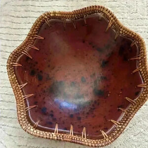 Vintage Woven Rattan Rim Stone Red Clay Pottery Decorative Bowl