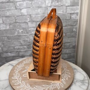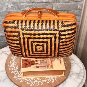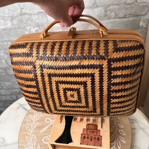 Vintage Woven Rattan Satchel Handbag. This rectangular bag has a handle on top and a clasp closure. The bag is crafted from woven rattan in a geometric square pattern, featuring alternating dark brown and natural-colored rattan stripes. The style is tribal,unique, art to wear,safari, African. Make a bundle and save 20% and I will give discount shipping. ❤️