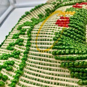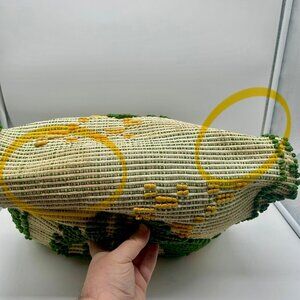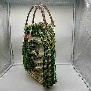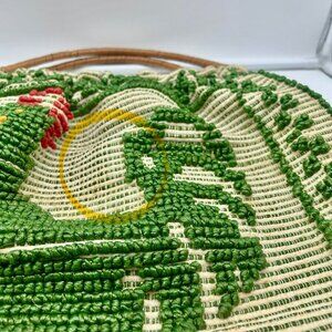 Elevate your style with this vintage woven rooster tote from Portugal, featuring a unique 70's boho chicken design in vibrant green. Perfect for vacations and adding a touch of retro charm to any outfit.