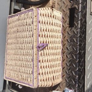 Elegant vintage woven jewelry box with a soft satin interior. Perfect for storing your treasures.interior lining is torn, with contents.Has a carry handle
