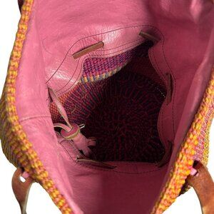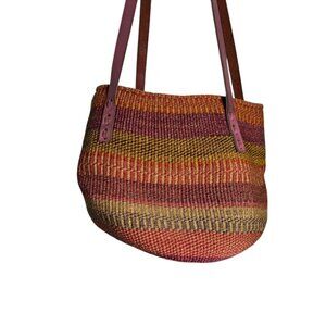 Vintage Woven Sisal Market Basket Tote Bag Leather Drawstring Closure Raffia