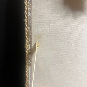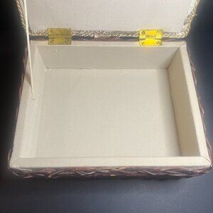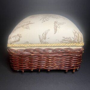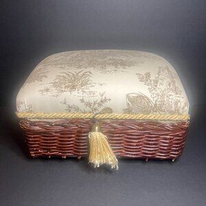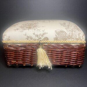 Selling a Vintage Woven Wicker and Fabric Trinket Box. It has a woven wicker base, a cushioned fabric top, a roped tassel, and a french country scene design. It measures 6" (h) x 10.75" (l) x 8.5" (w). There's some wicker breakage along the bottom (shown in the pictures), but it's in otherwise good condition.