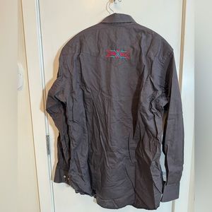 Vintage Wrangler rodeo shirt, cowboy cut style. Made in America. Red and Bright Blue embroidery on left chest, left sleeve, and center back. Pointed back yoke. Very small sunfading area on back collar, see photo.