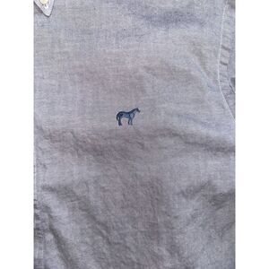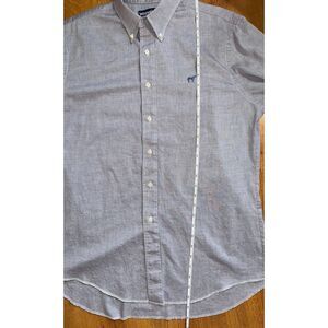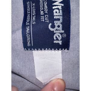 Vintage men's Wrangler button up Western shirt. Embroidered horse logo. Wrangler Cowboy Cut Regular Fit X-Long Tails Single Needle Tailoring. Tag is not readable. Measurements provided from pit to pit show 23-24", which is consistent with men's large. Front length measures 30.5 inches, back measures 32 inches. Very good condition vintage shirt. Only flaw is some discoloration at the fold of the collar, shown in pictures. Coming from smoke free pet free home.