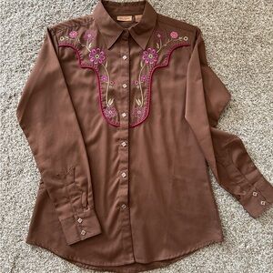 Vintage Wrangler Retro Women’s Dark Brown Western Shirt with Pink Embroidered Flowers