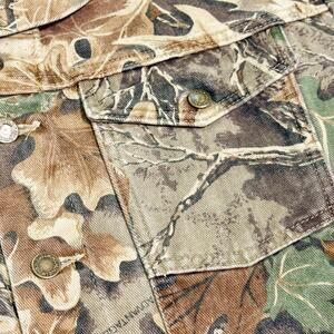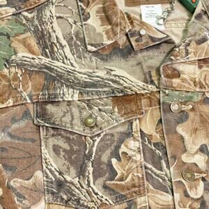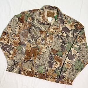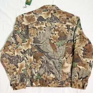 Wranger camo jean jacket in excellent condition, made in the USA. No flaws spotted beyond wear on the leather patch inside the jacket. Trucker cut, soft fabric, 100% cotton body. Realtree realistic camo pattern all over.
