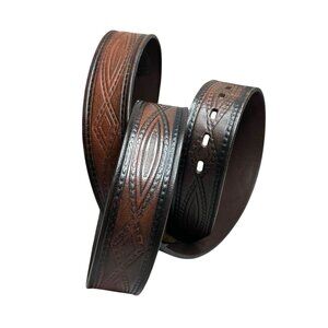 This vintage detachable leather belt features intricate tooled detailing, offering a distinguished look. The brass buckle adds a classic touch and durability. Ideal for both formal and casual attire, it exemplifies craftsmanship and timeless style. Western style w/ buckle snaps.