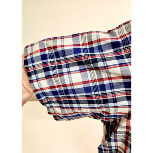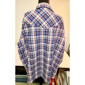 This vintage Wrangler Wrancher shirt is a must-have for any cowboy enthusiast. The pearl snap closure and multicolor Red white & blue plaid pattern make it a stylish addition to any wardrobe. The shirt is made of comfortable cotton material and features short sleeves and a collared neckline with a point collar style.