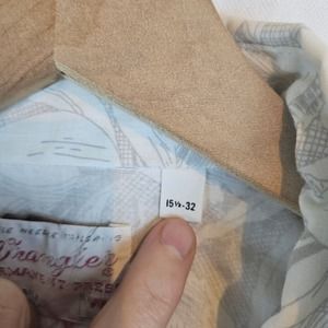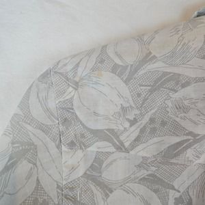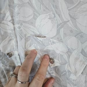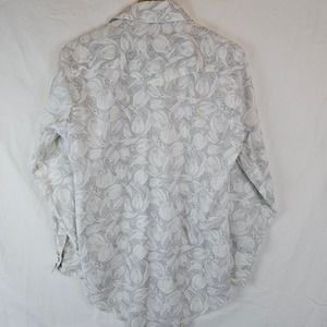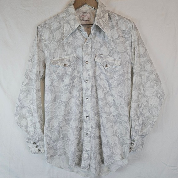 1970's Wrangler Pearlsnap shirt with gray floral pattern on white fabric. Silver hardware on pearlsnap buttons, double breast pockets, printed collars. Snaps at wrists as well. penhole on left pocket flap. Good overall vintage condition, though there's some staining (see photos). I couldn't make sense of the size tag on the shirt (says 15.5-32), so see measurements: